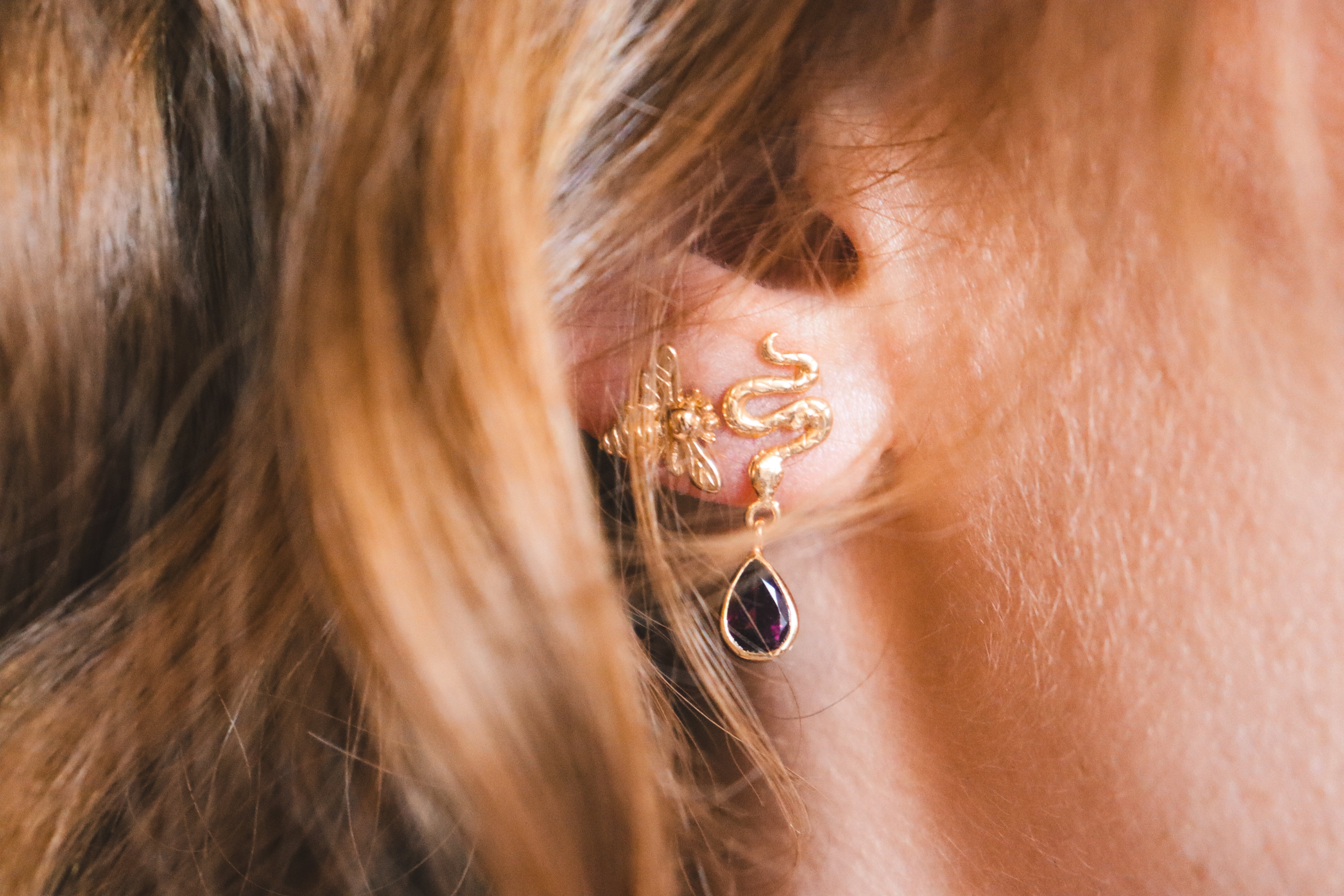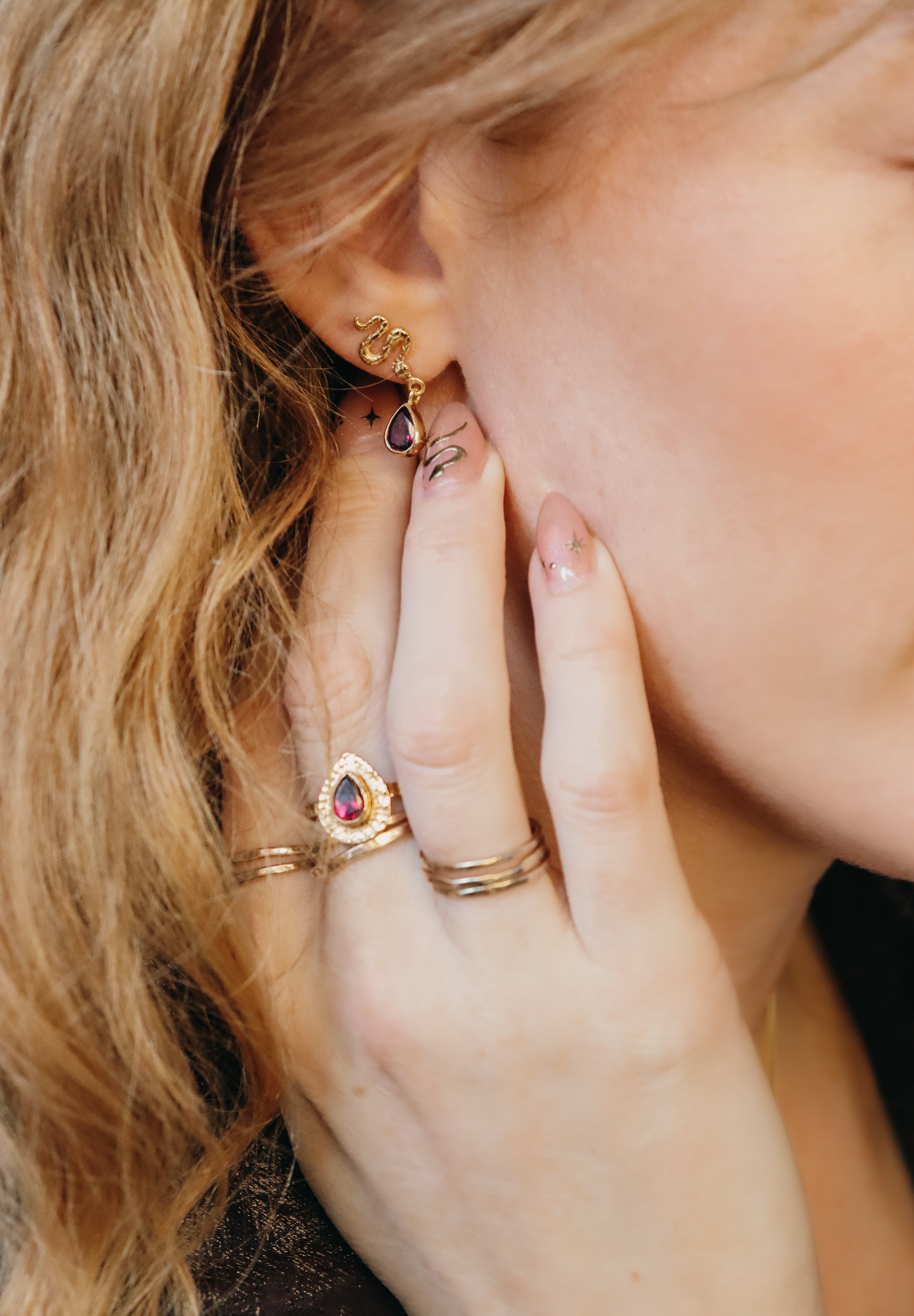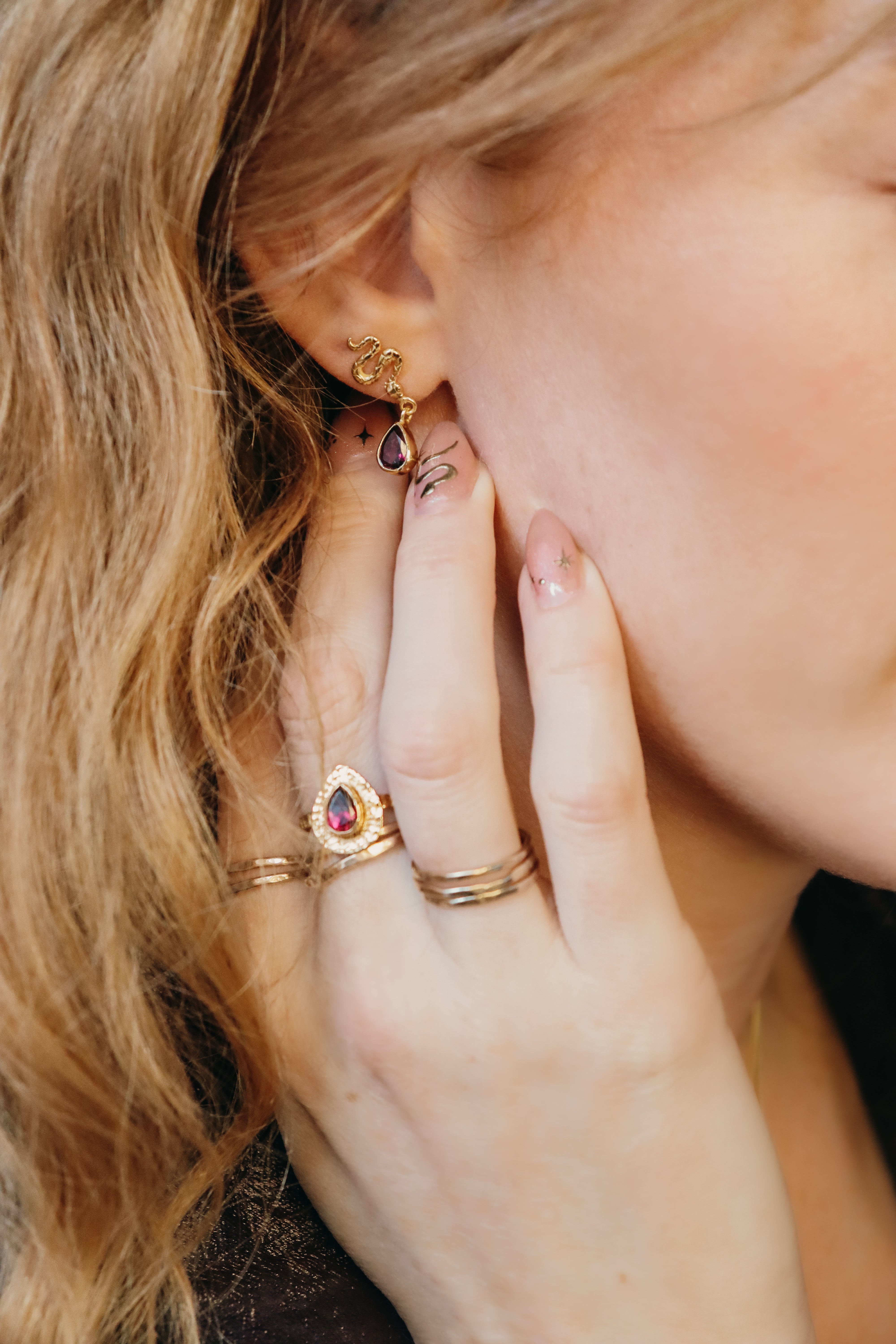 Snake studs with tourmaline drops, offering protection and transformation, grounding you as you shed old skins and rise renewed.